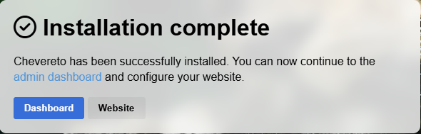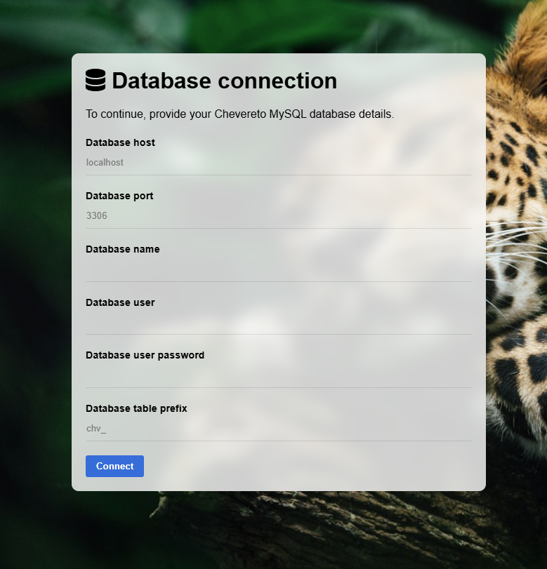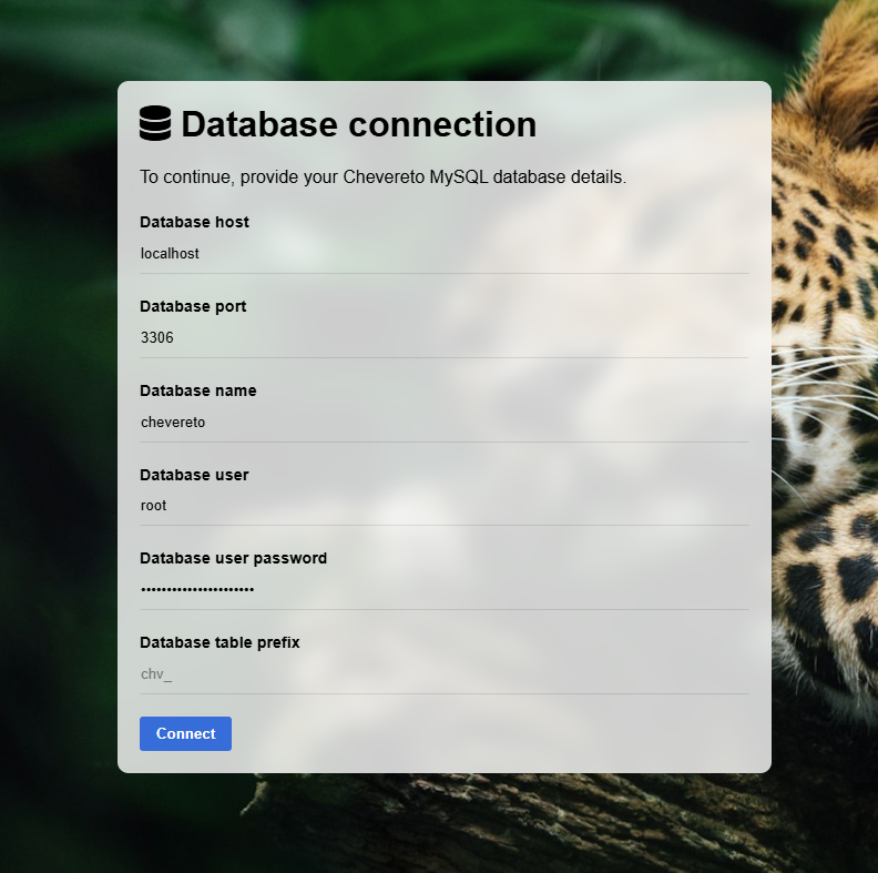 Database host: localhost Database name: chevereto Database user: root Database user password: YOUR_DATABASE_PASSWORD on the steps above