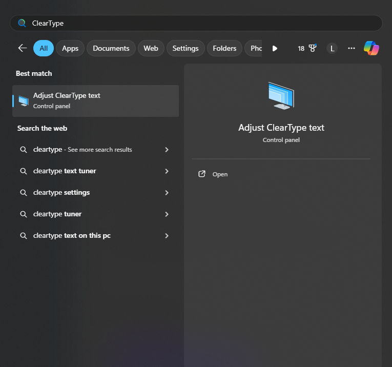 - After connecting to your Windows VPS, press Win + S and search for ClearType.