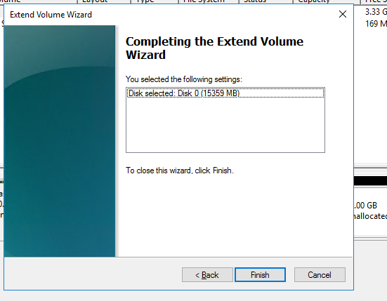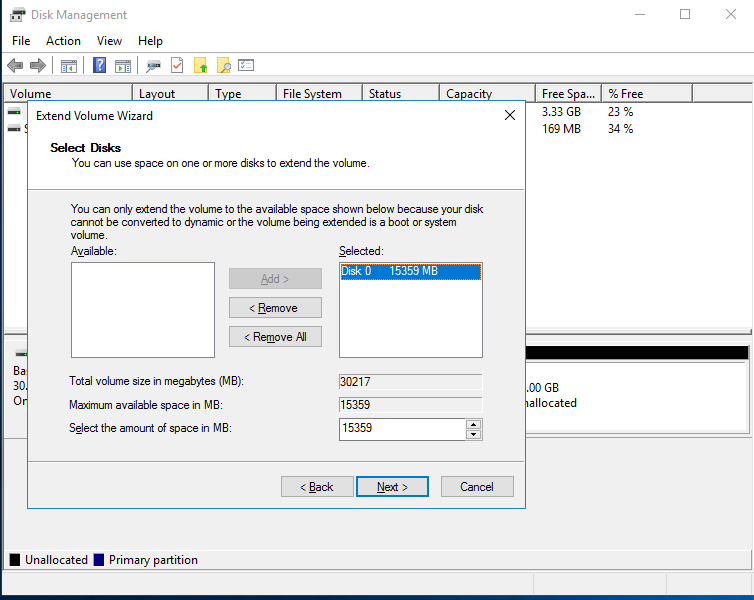 4) Choose the amount of space you want to extend ( In this case, we have 15 GB unallocated and we want to extend all spaces, hence, 15359 MB )