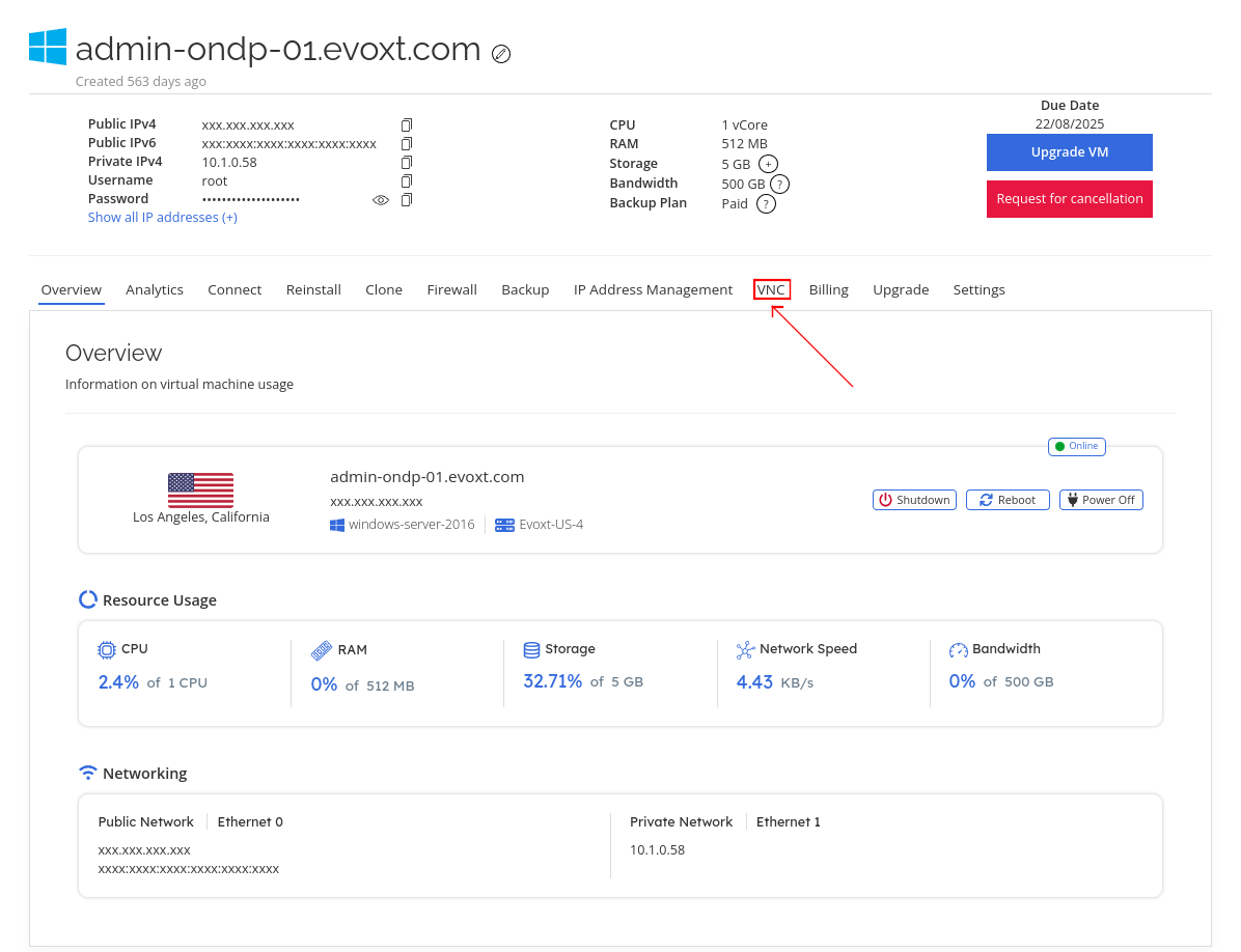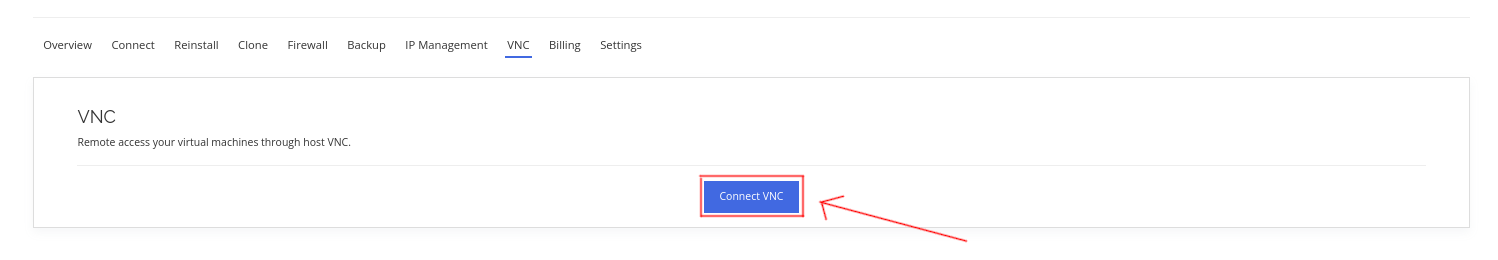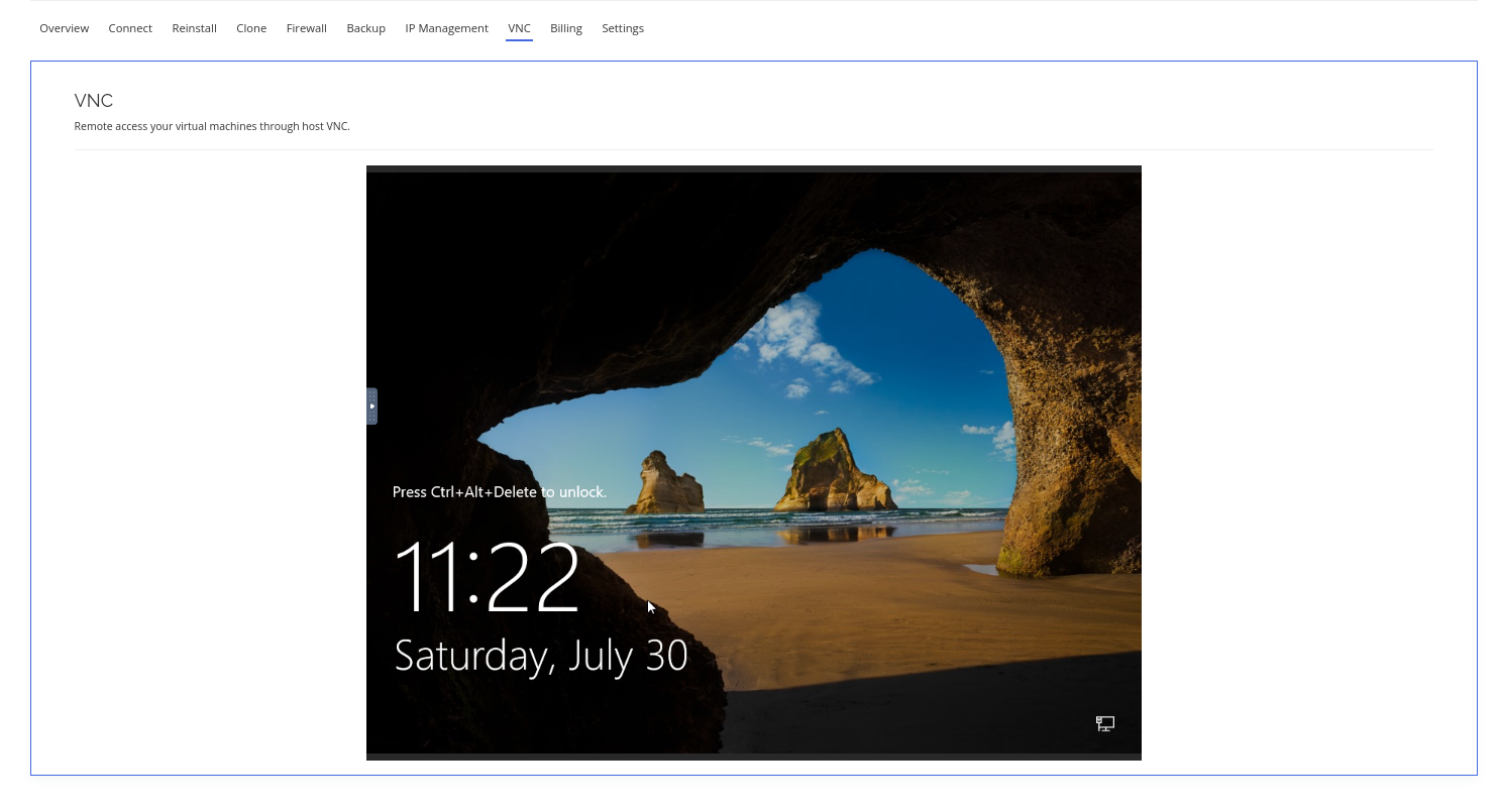 With Evoxt's VNC, the VNC server is located on the host node. This means that it can connect to a VM even when the VM's network connectivity is down or when the VM is stuck in a boot loop or grub, users can still connect through VNC to be able to perform troubleshooting. Also, with Evoxt's VNC, if your client device does not have a proprietary remote desktop protocol such as RDP/SSH client installed, you can still perform a quick remote control through VNC.