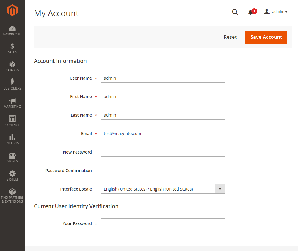 To change your password, click on your admin on the top right and click account setting.