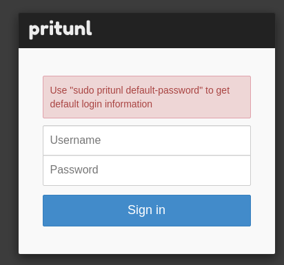 Pritunl require you to get the default password through SSH, to get the default password, use the following command.