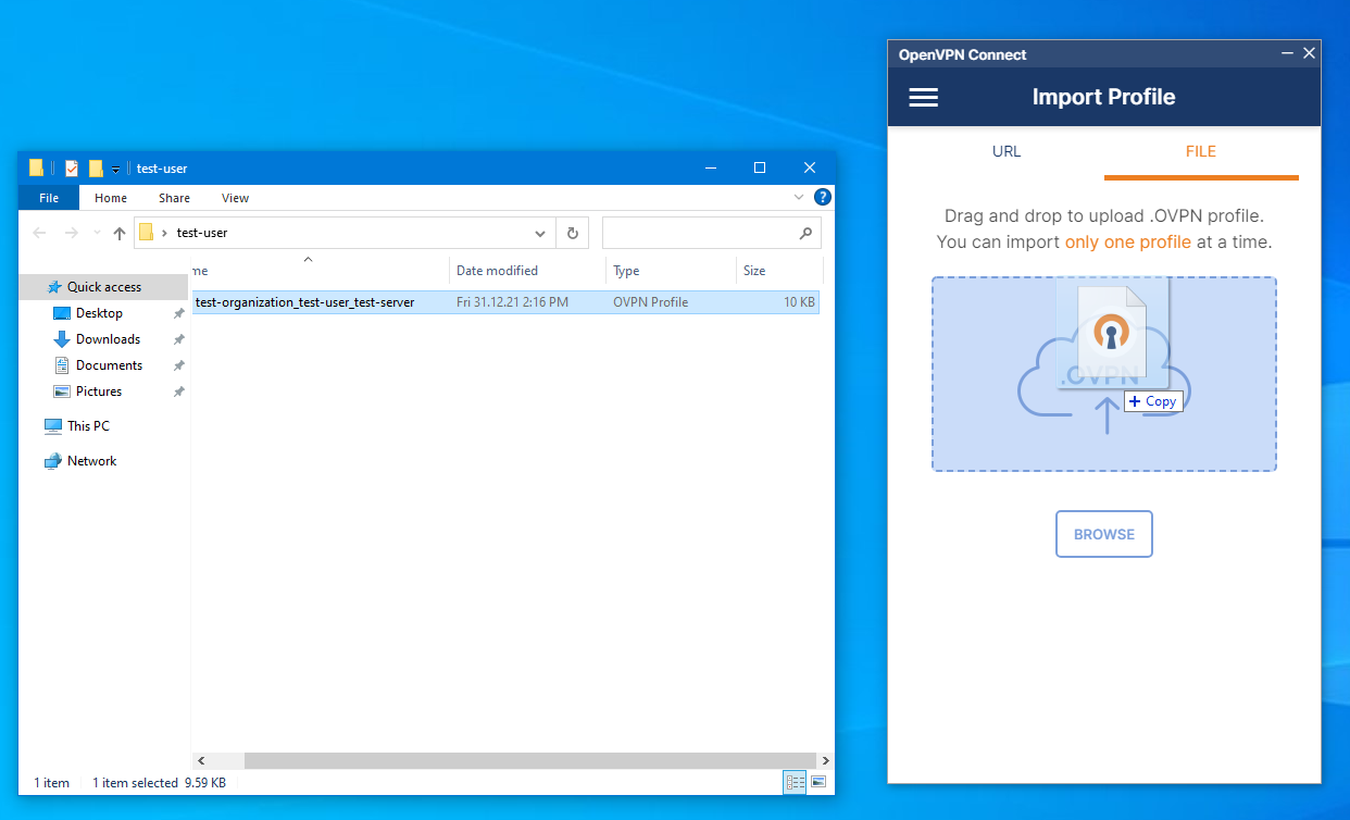 Then, drag the OVPN file extracted to your OpenVPN client as shown below.