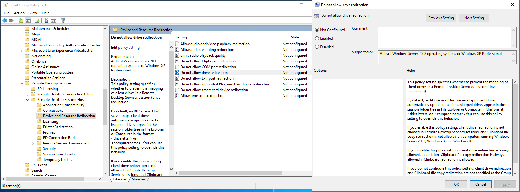 - Ensure "Do not allow drive redirection" is Disabled (or Not Configured).