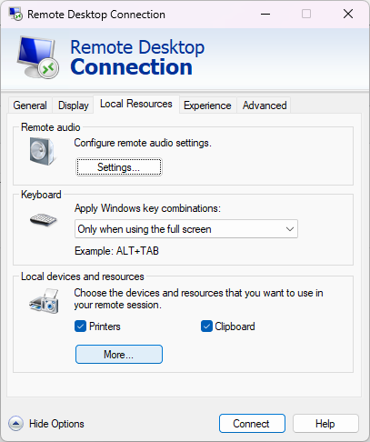 - In Remote Desktop Connection → General → Save As… to store an .rdp file with redirection enabled.