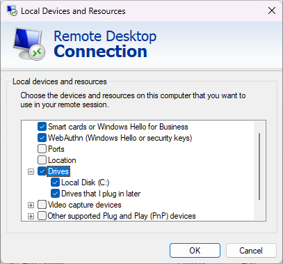 - USB drives / external disks: appear under Drives if selected (Windows client). For full USB device redirection, you may need third-party USB redirection if the device isn't handled as a storage volume.